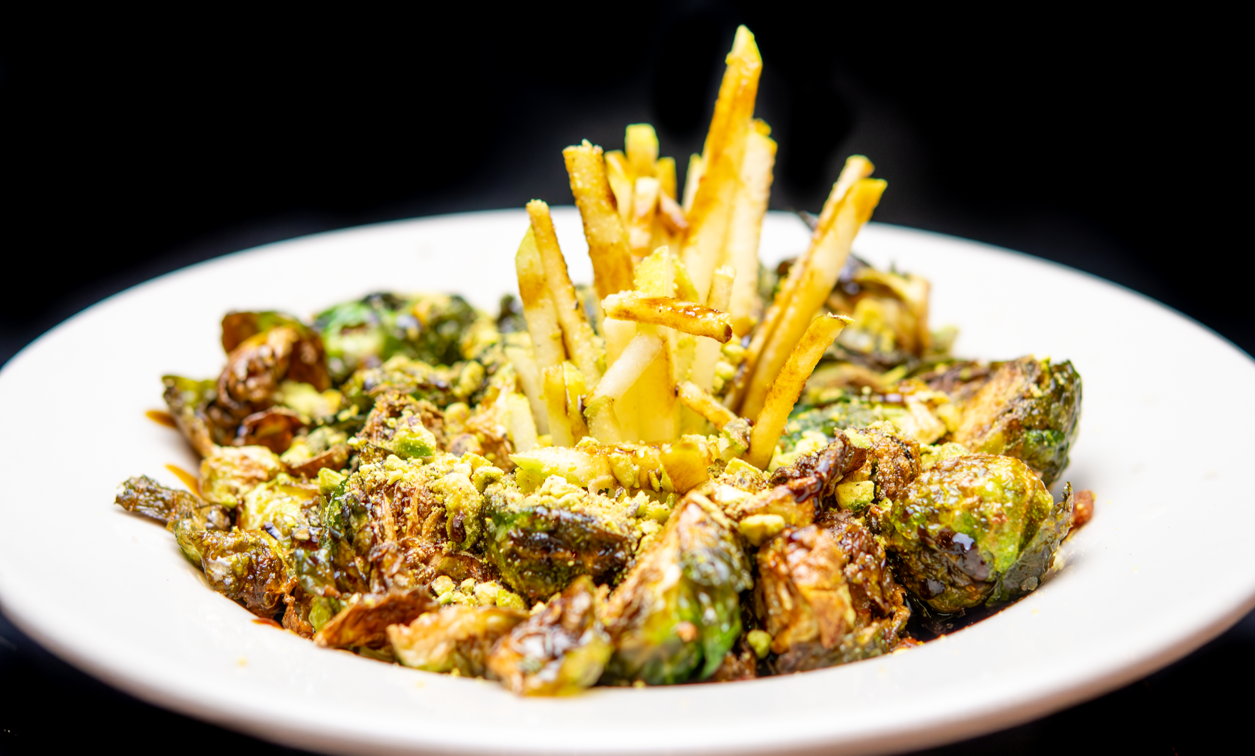 Flash fried, bacon bits, honey bourbon molasses, Grannysmith apples and chopped pistachios