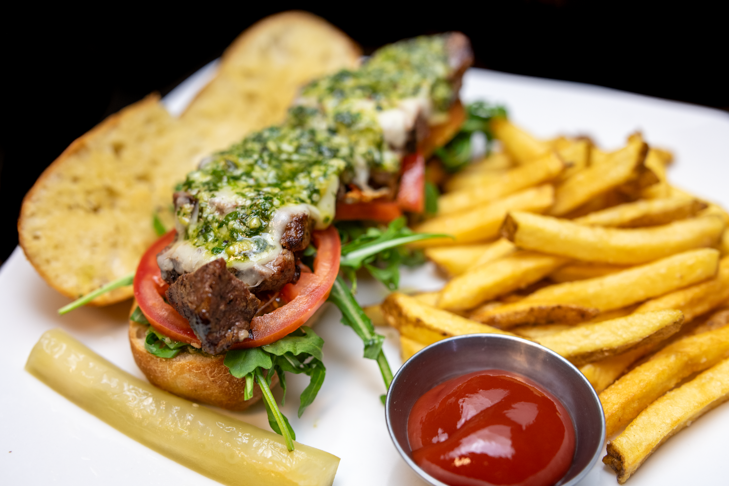 Grilled flat iron steak, walnut pesto, fresh arugula, tomato and melted mozzarella served open faced on a toasted baguette