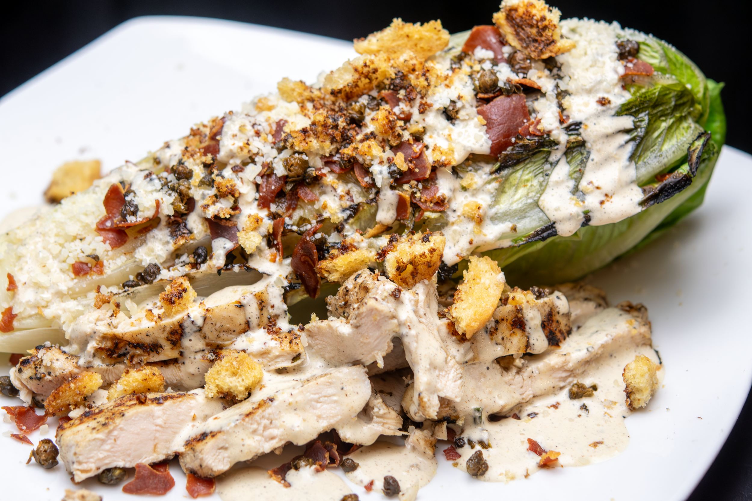 Grilled romaine hearts, house Caesar, crispy prosciutto, fried capers, house croutons and grated Parmesan
